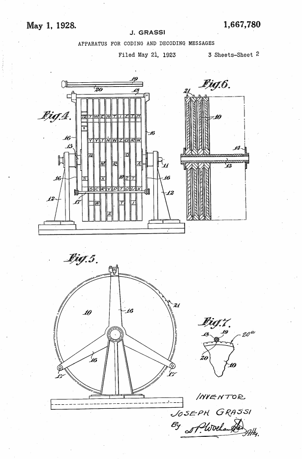 The Cryptocode was intented by Joseph Grassi, who filed a patent on June 1st, 1922 in the UK, then in several other countries in the following years.